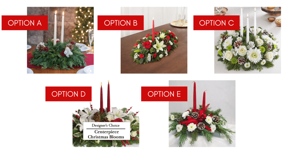 Please view the available style options below. When checking out, list the letter of your selected centrepiece in the order form.